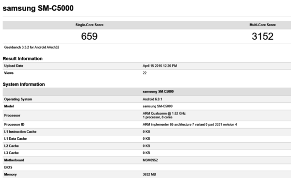 配置方面,三星Galaxy C5的型號為SM-C5000,單線程跑分659,多線程跑分3152,搭載主頻為1.52GHz的八核心(A53架構(gòu))處理器,運存為4GB,運行Android 6.0.1操作系統(tǒng)。